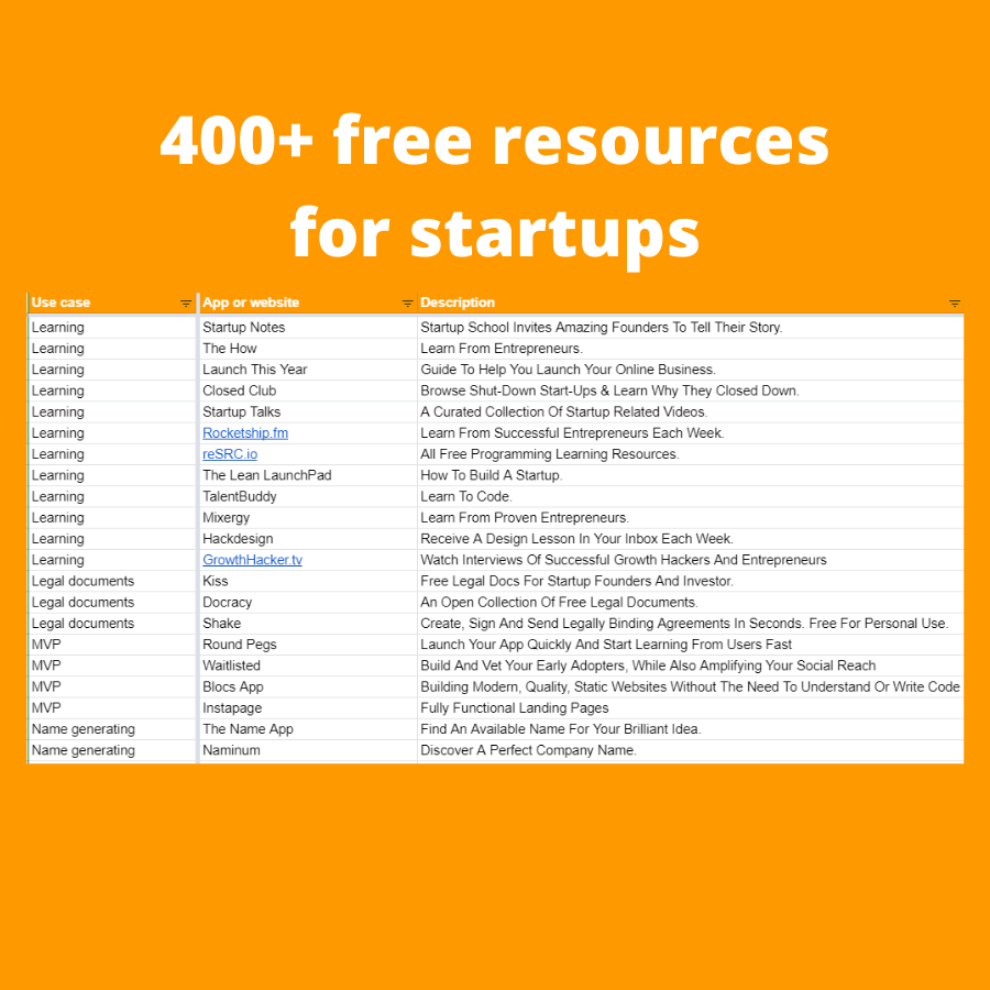 This is a comprehensive list of 400+ resources curated to help you build your next startup, MVP, or side hustle frugally. This list includes apps, tools, videos, podcasts, and more. Whether you’re a student looking to build your next project, or an entrepreneur looking to build your next startup - this list will help you get started without spending a single penny!